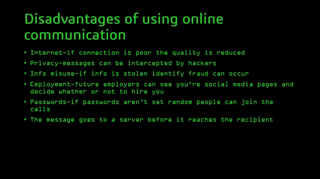 To memorise all of this we used a website called KnowItAllNinja (linked at the bottom of the page "Knowitallninja") doing tests on technical jargin and how it works. As well as this we did a variety if work sheets for example "list the pros and cons of cloud storage" or "threats to online data". To end this all of we did an exam about the online world using what we already knew and Knowitallninja to revise